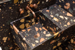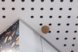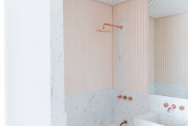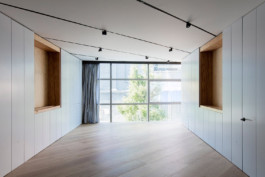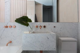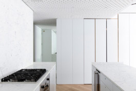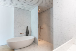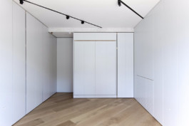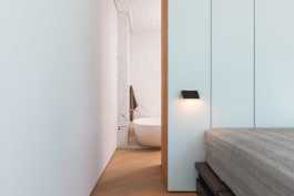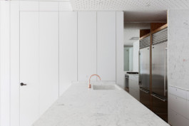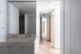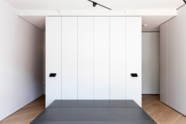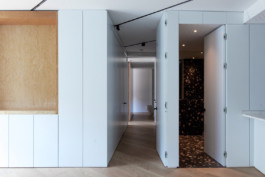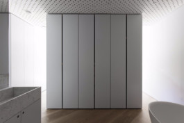 This apartment, designed by MOS, is defined through cabinetry as hollow walls that enclose rooms and provide storage for the resident’s extensive collection of designed objects. The cabinet-walls in the common area contain two square niches for display and taper gently in plan to make the space feel larger in perspective. The cabinets are both the walls of a room and objects that float when placed against the diagonal pattern of the wood floor, which, when reinforced by light tracks in the ceiling, forms a pattern of lines running across the whole width of the apartment. Secondary spaces have dropped ceilings with a pattern of holes, providing visual interest, acoustic absorption, and seamlessly integrating recessed lights and vent diffusers. As counterpoint to its collection of unifying, all-over-patterned surfaces, the apartment has three materially monolithic bathrooms: one in engineered stone, another in custom ceramic tile, and a third in honed marble.